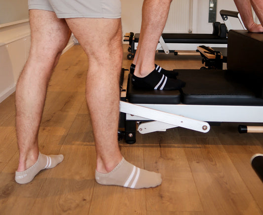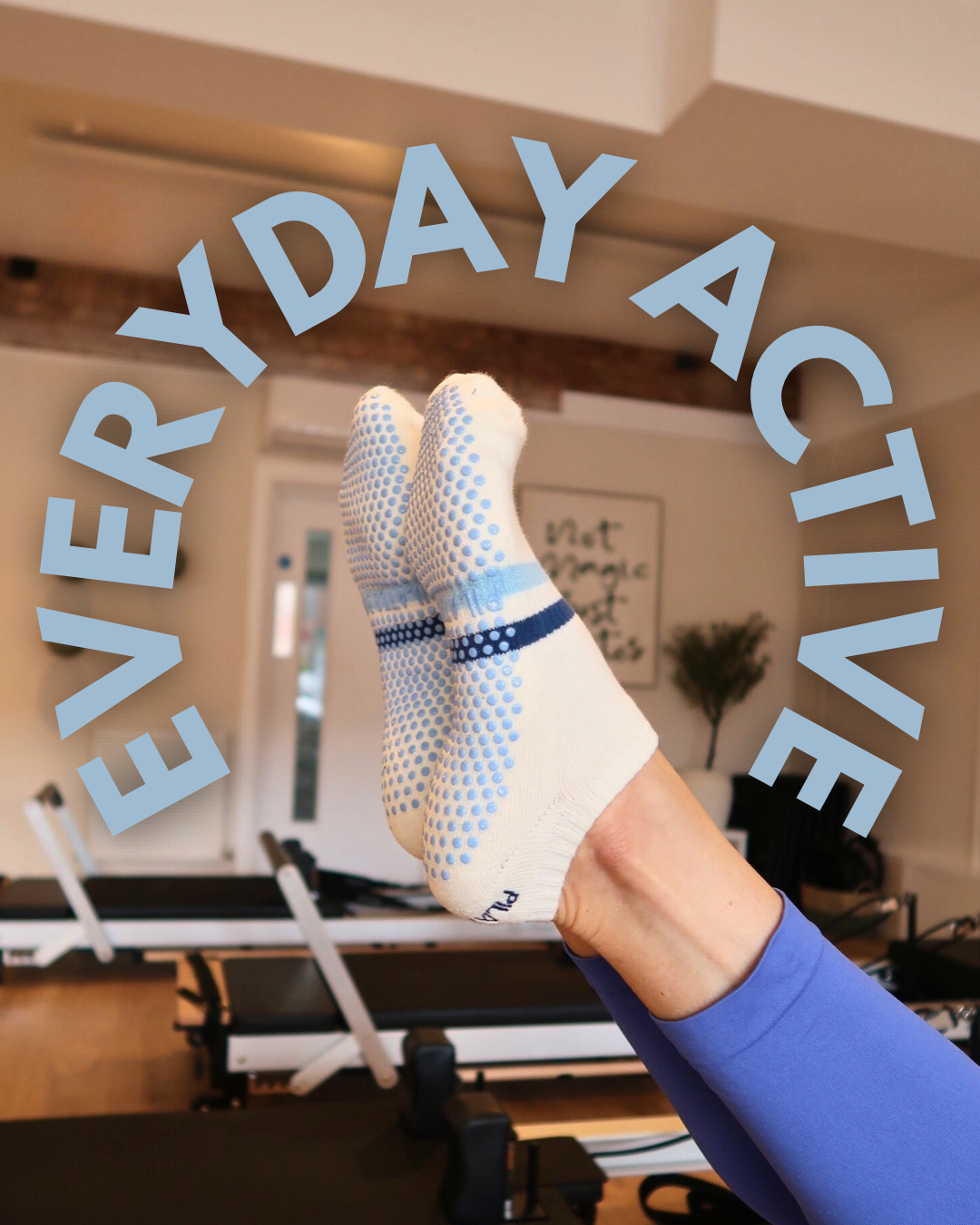 Our entire Everday Active Collection, featuring 4 pairs of ankle grip socks in Cherry, Coastal, Sandstone, and Shadow.